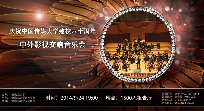 2014年9月24日19:00,艺术学部将在1500人综合报告厅举办庆祝中国传媒大学建校六十周年中外影视交响音乐会。届时,中国传媒大学交响乐团将为大家奉献一场精彩的视听盛筵,与全校师生共同庆祝母校六十岁华诞。 领票时间:2014年9月22日——24日 8:00—11:30 13:30—16:30 领票地点:综合楼1403房间 领票方式:教师凭工作证、学生凭学生证领取,每证限领一张。 演出时间:2014年9月24日 19:00 演出地点:1500人报告厅 咨询电话:65783414