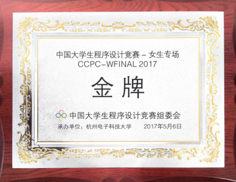 5月6日,2017中国大学生程序设计竞赛—女生专场在杭州电子科技大学举行,经过5个小时的激烈比赛,由我校15级信息安全专业于帅、15级数字媒体技术专业王怡楠和15级电子信息工程专业桑青格组成的代表队斩获一枚金奖。