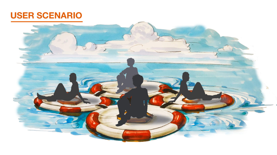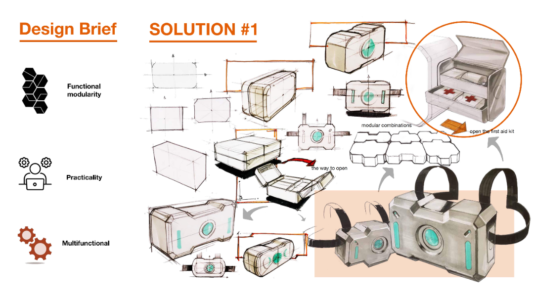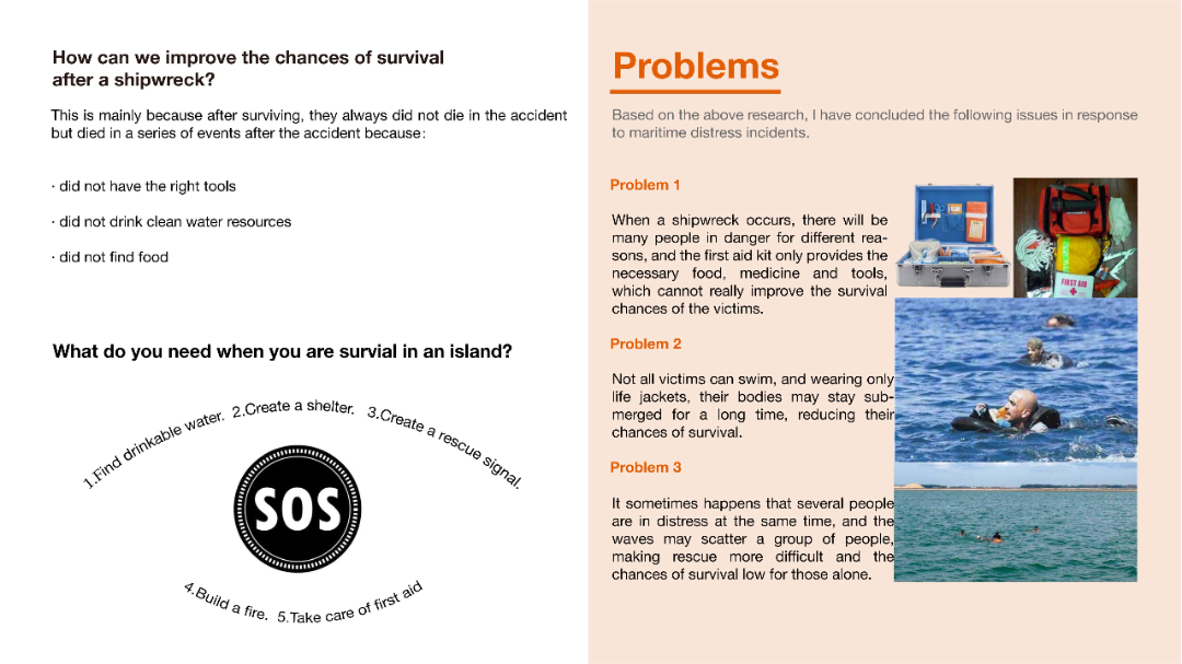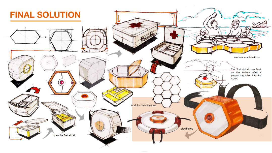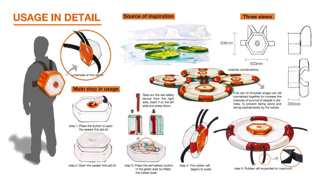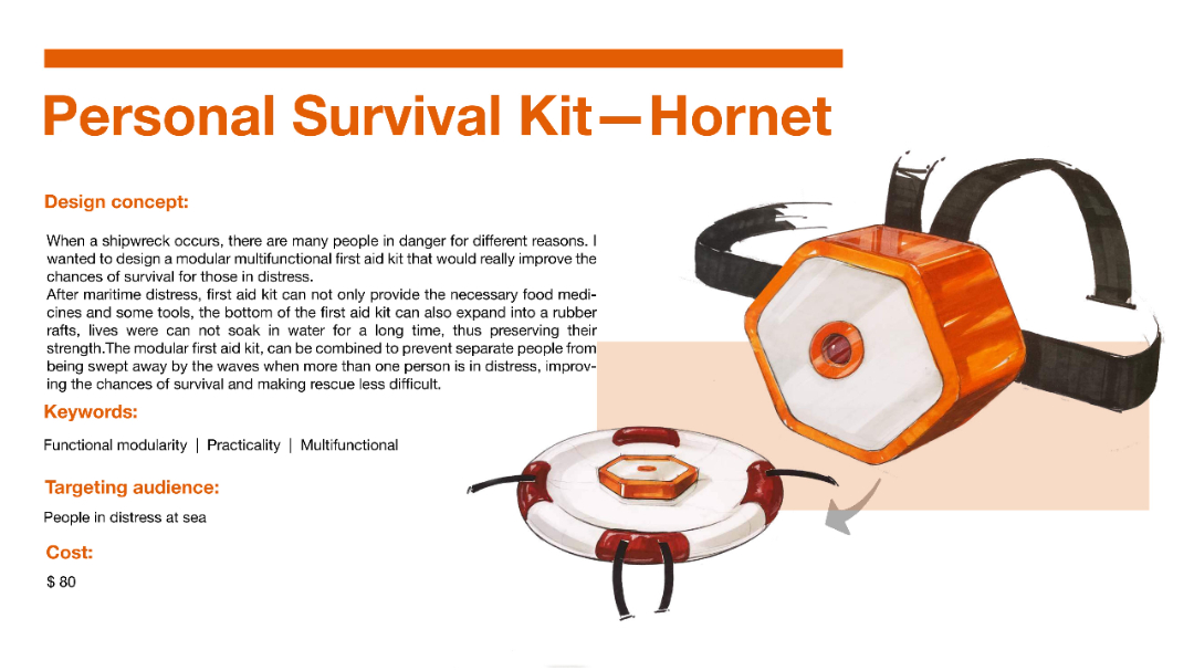 此项目是针对人类面临海难发生时,而设计的一款多功能的救生箱。它能够显著提升受难者在面临海难时的生存的机会。这个救生箱不仅能提供必要的食物、药品,还能够满足一些基础工具的需求提供。例如在发生海难的时,救生箱膨胀可以作为救生圈使用,漂浮在海面上。当人多的时候,可以将多个救生箱连接在一起,增加生存面积从而提升受难者生存下去的机会。求生箱的颜色选择是偏明亮的颜色,内部附带的电源会给求生灯供给电力,这样会更大的提升被发现的机率。