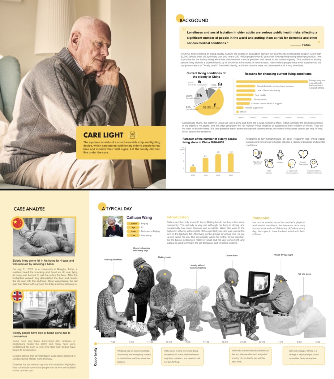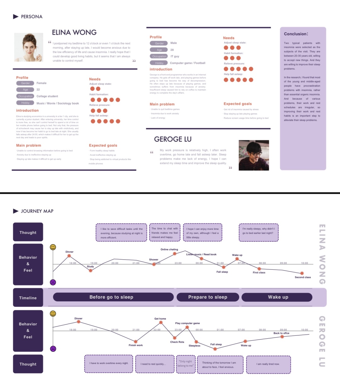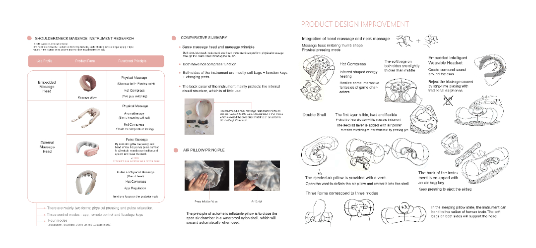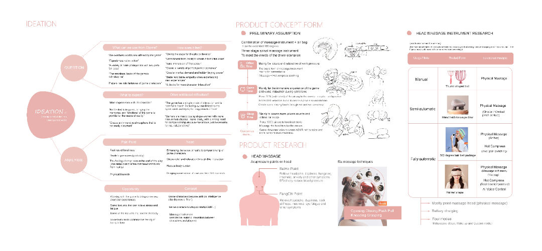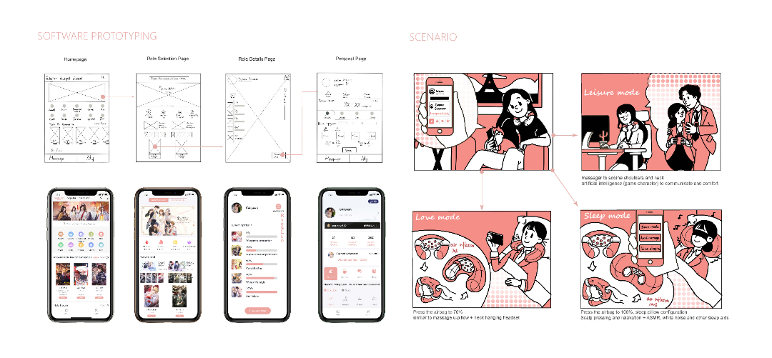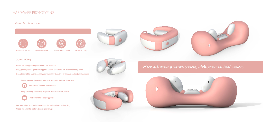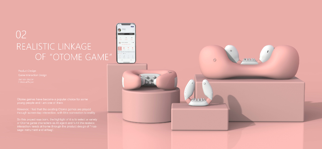 第二个项目我尝试了软硬件的结合,允许用户以多模式的方式与Otome游戏中基于AI的不同角色进行交互。作为Otome游戏的资深玩家,我希望为像我这样的年轻单身女性提供更好的游戏互动体验。在前期,我从“游戏”、“玩家”和“爱”三方面着手,来激发自己对于将Otome游戏与现实联动的灵感。在产品设计上我强调使用性与互动性,并着重关注了三个问题:打造隐秘的私人空间、与游戏角色的互动实感和长期游戏可能导致的脊椎疼痛和大脑疲惫,根据这个概念,我重点调研了头部按摩,颈部按摩和空气枕,并总结了两个可实现性:头部按摩与颈部按摩的二合一,按摩仪与空气枕的结合。由此我设计了一种以Otome游戏角色为人工智能角色的三态式按摩仪,用户可以通过控制空气的进出体积来实现不同的产品形态。我设定了三个最主要的私人空间——办公,休闲和睡眠,并拟定了相应的产品形态——按摩仪,颈枕和睡枕。