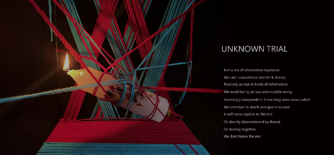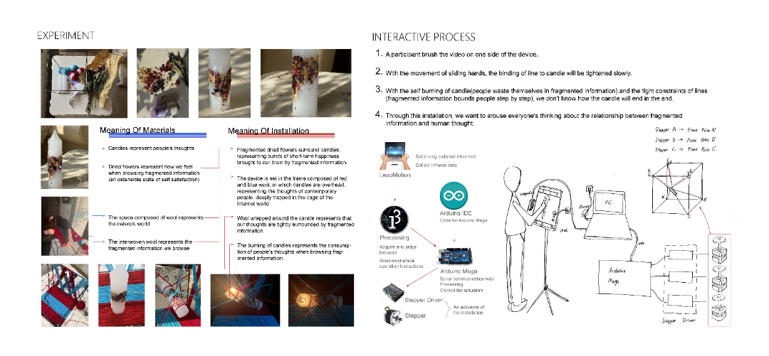 在最后一个项目中,我设计了一个互动艺术装置来表达我对碎片化信息束缚个人思想的悲剧性态度,主要研究了艺术性和互动技术。装置将通过LeapMotion来捕捉参与者滑动屏幕的操作,并通过一系列程序将动作信号转化为机械指令,发送到微控制器,它将驱动步进电机的皮带轮收紧毛线,达到参与者不断浏览碎片化信息,毛线对点燃蜡烛的束缚将不断收紧的艺术效果。在这个装置下,蜡烛-人的思想-将面临三种结局,自我燃烧结束,随着毛线收紧而肢解或与毛线一同燃烧殆尽,它们无一例外都是悲剧。我希望通过这个装置让人们重视碎片化时代个人思想的濒危性。