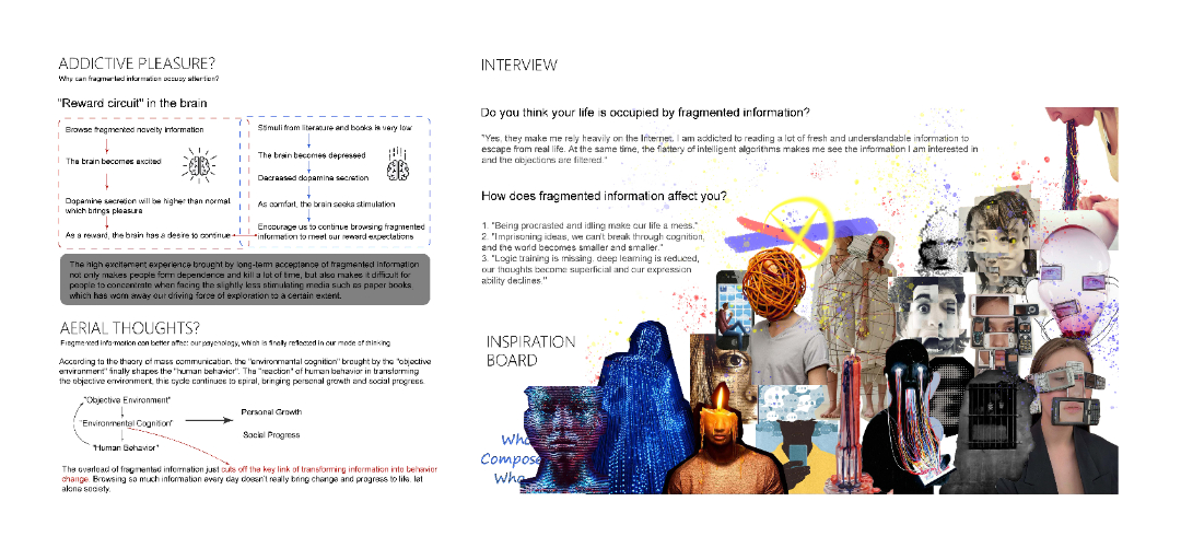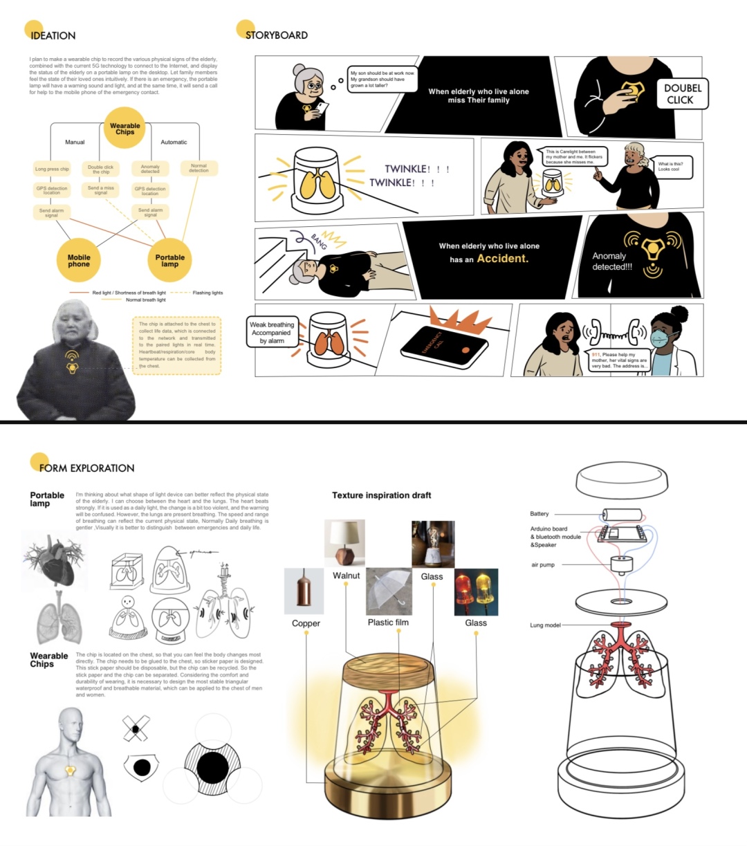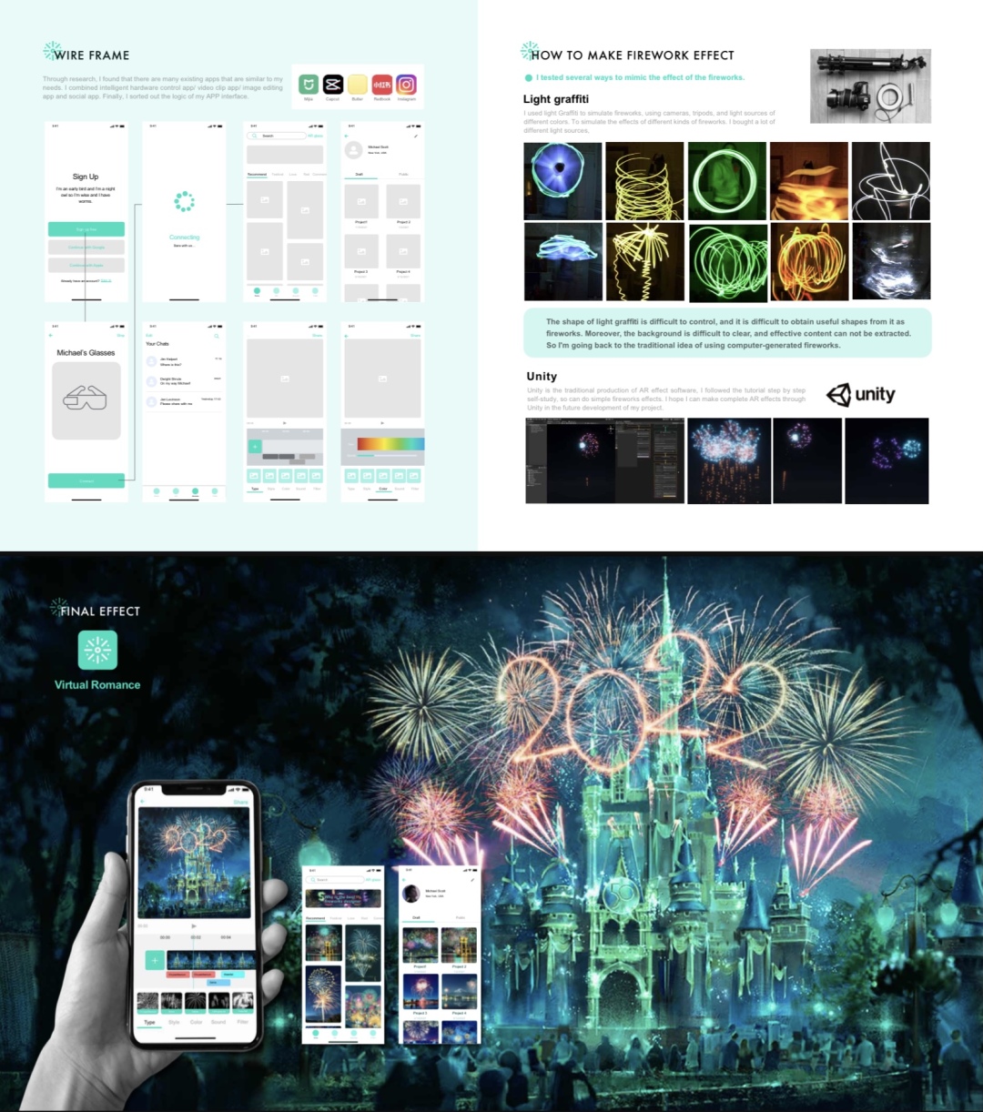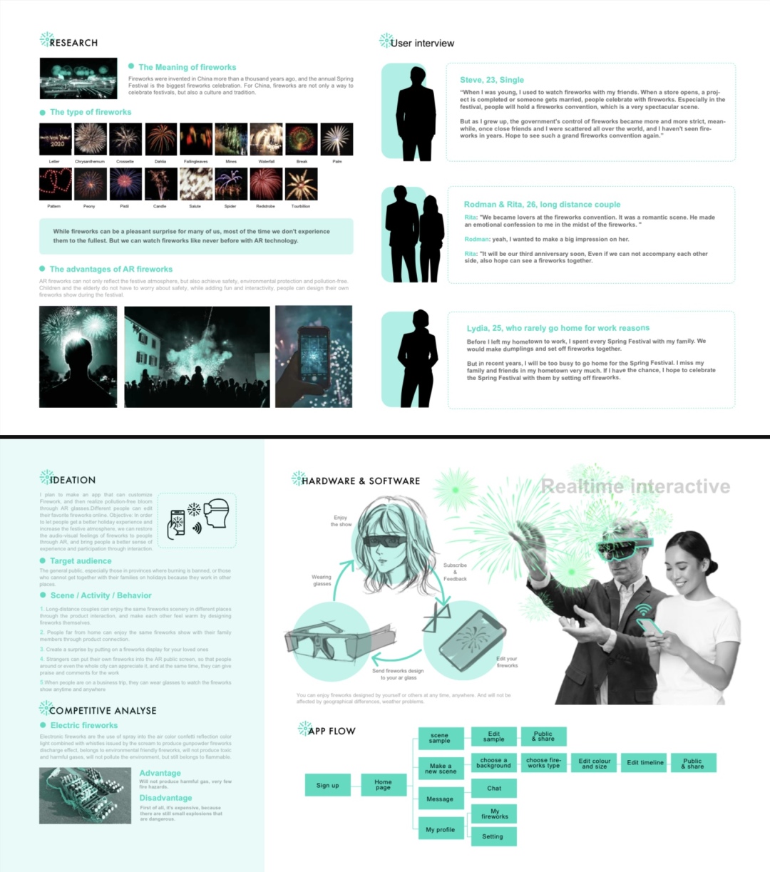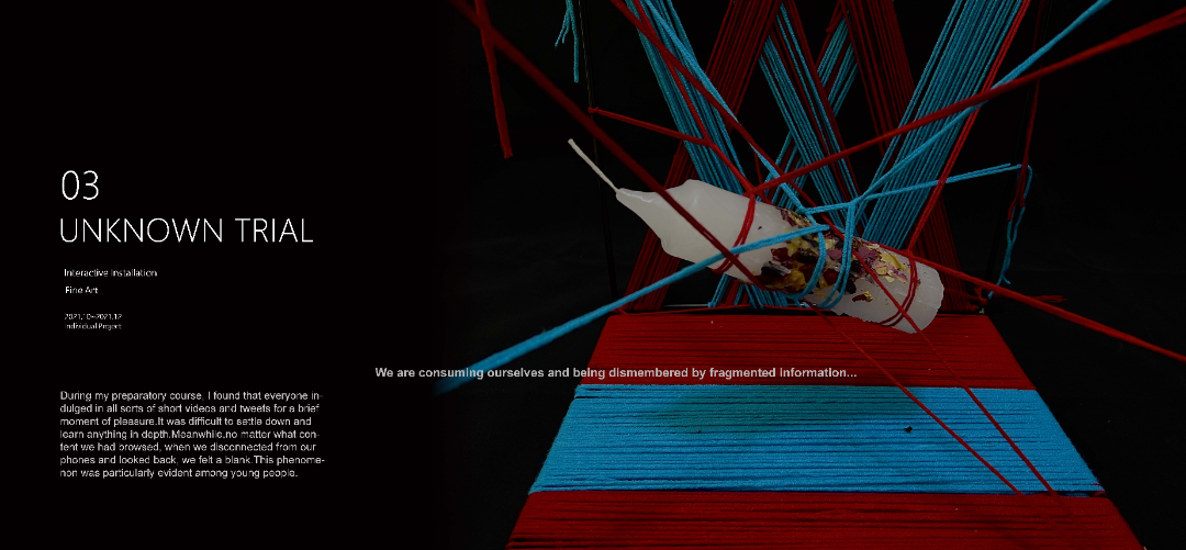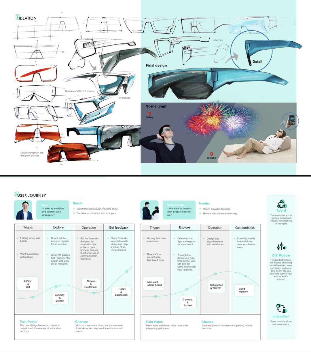 在中传预科的这段时光里,我尝试了各种各样的创作形式。从商业研究方向的“用户旅程图”“利益相关者图”“服务蓝图”“用户画像”等到软件方面的“线框流程图”“Figma高保真”“Rhinoceros 和 Keyshot 建模”等,我学习了很多交互设计领域的“干货”。在老师的指导下,我进行了完全不同方向的尝试,有服装设计、产品设计、艺术交互装置等等。我很感谢学校与老师的栽培,让我对交互设计的兴趣愈发浓厚。