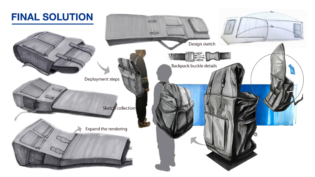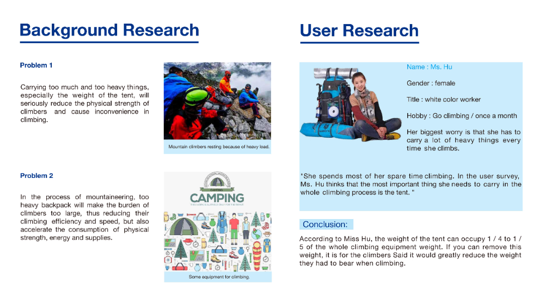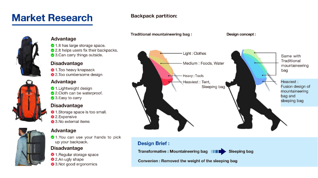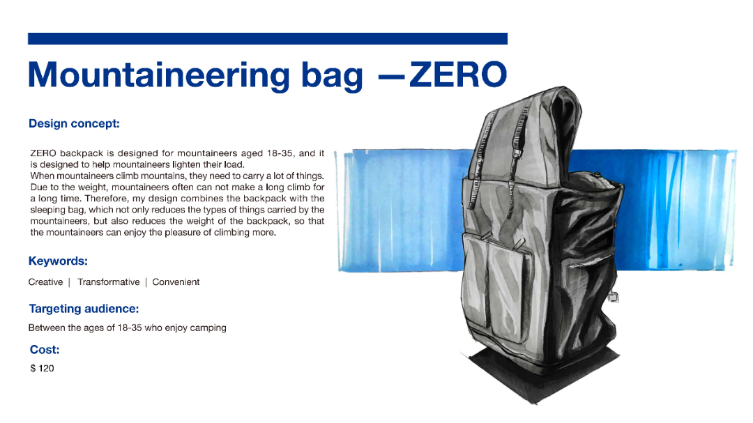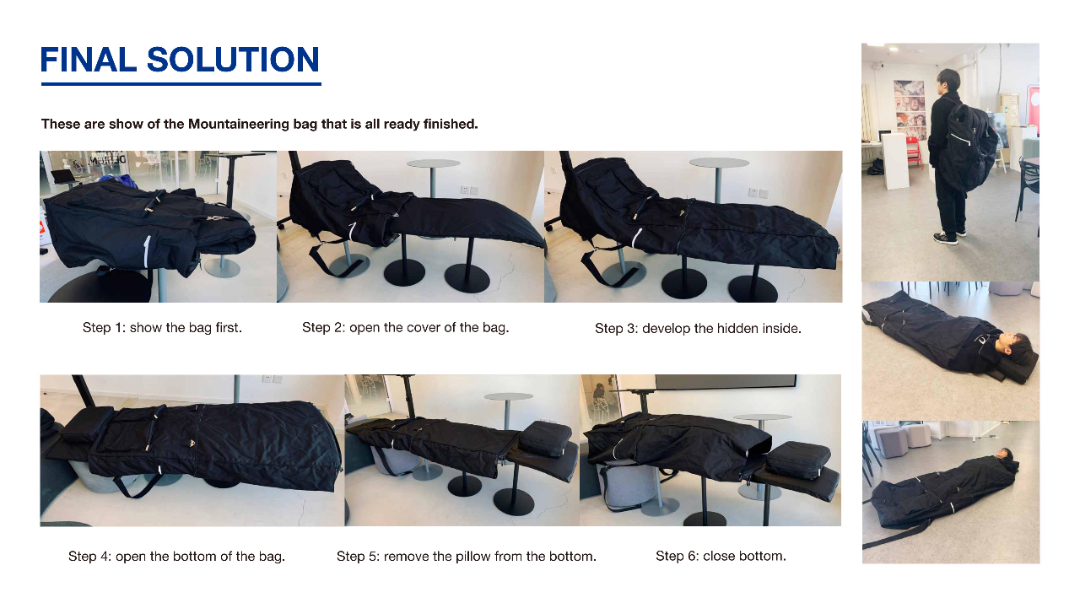 此项目做的是一个背包,针对徒步登山用的多功能性背包,是将背包的空间重新再进行设计,夜晚时能够当成睡袋使用,其有保暖的功能,还减少在登山中设备的数量。