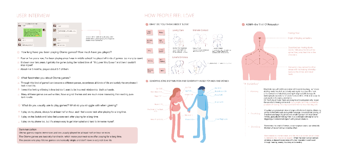 在交互感官体验上,我在仪器里嵌入了穿戴式耳机来打造二人世界的私人音域,并通过热敷和湿敷来营造恋人亲吻的触感。用户可以通过配套app来挑选购买各种互动角色,通过Otome游戏来提高与角色的亲密度,拓展更多由仪器带来的亲密体验并自定义互动场景功能。
