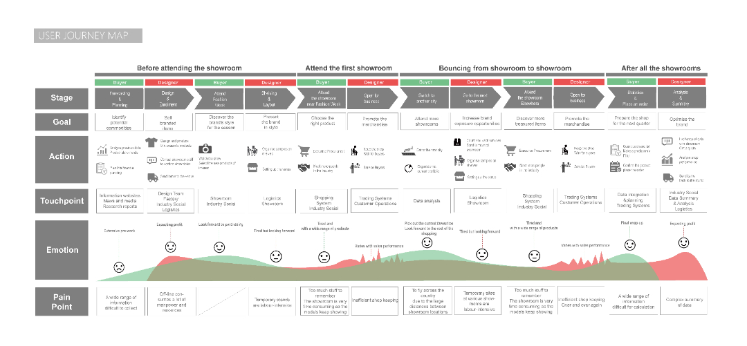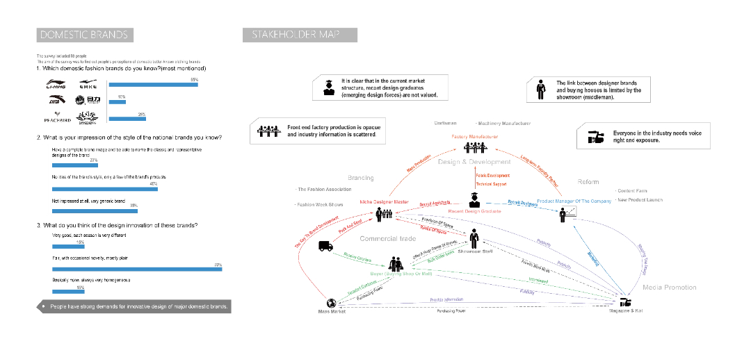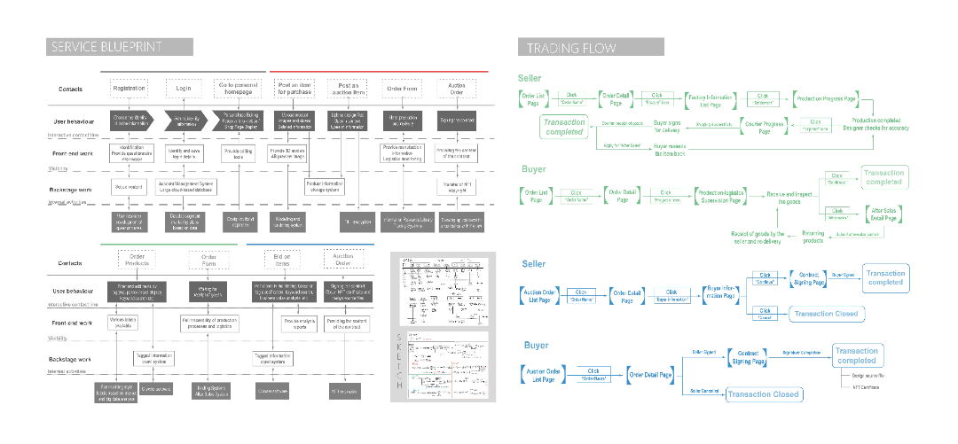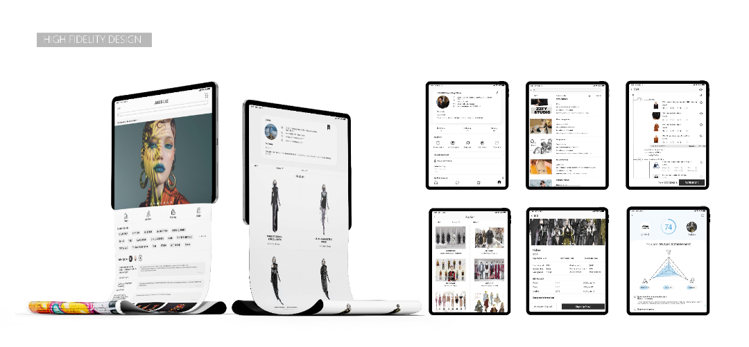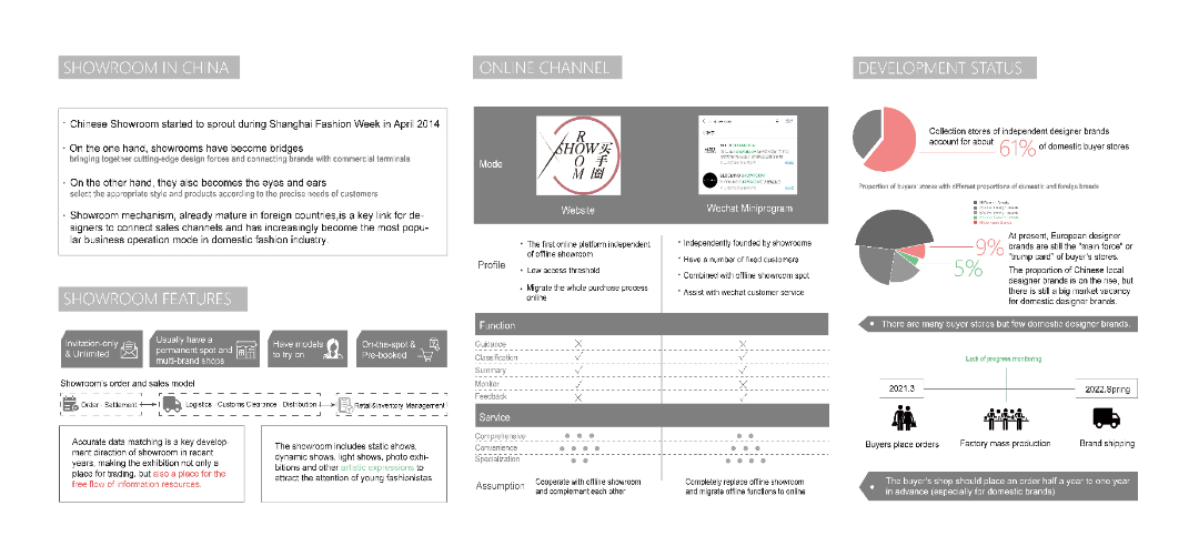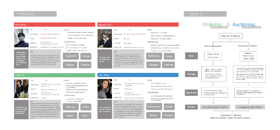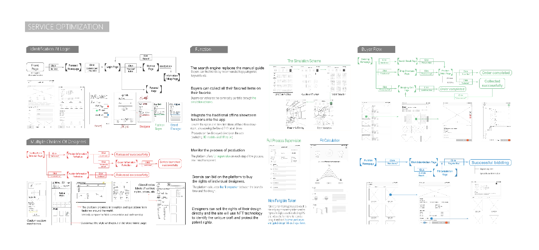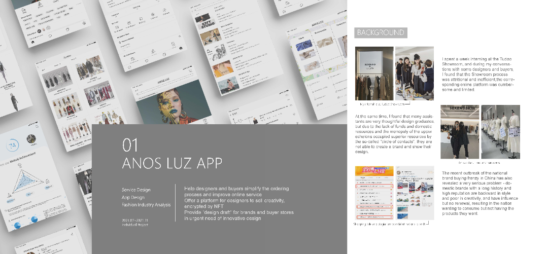 第一个项目源于我在时尚行业的学习与实习经历,在这期间,我发现行业有三大痛点:线下展厅效率低下,设计毕业生生存艰难和知名品牌创意匮乏。通过对行业主要商业模式“showroom“进行各维度的调研—特点,线下用户旅程,线上渠道等,我逐渐明确了现有时尚行业的情况 并作出相应产出。通过这些分析,我整合出了利益相关者网络并推演出了目标用户,在此基础上设计了平台的两大功能--在线订购服务优化和NFT设计拍卖。它将为品牌带来更多的创意设计,为设计带来更多商业化的可能。