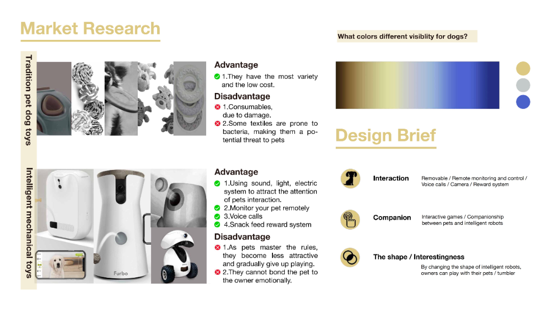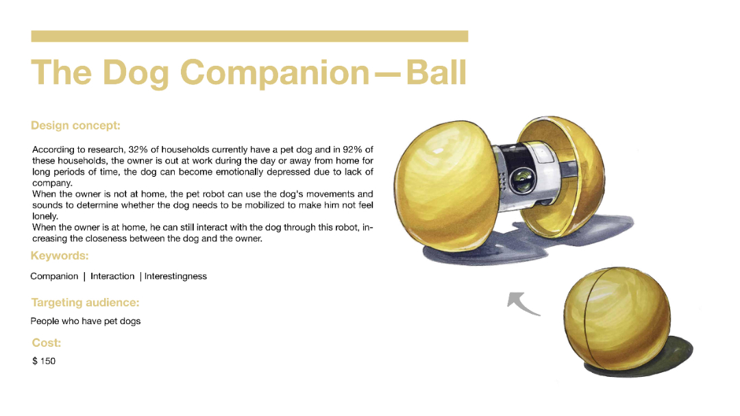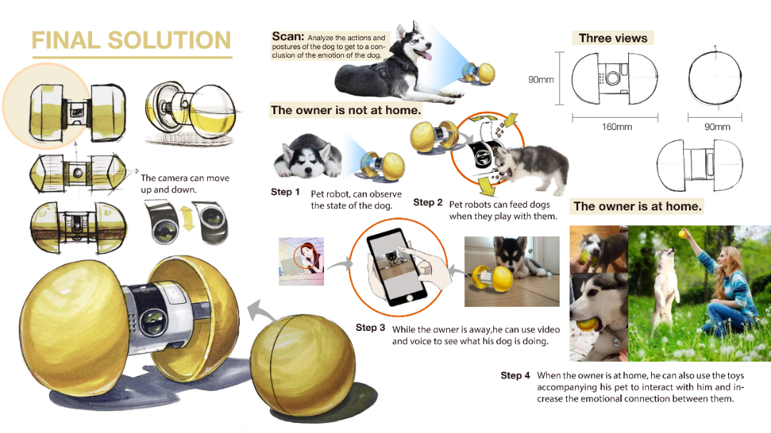 此项目做的是一个宠物陪伴的玩具,因为在日常生活中,养宠物的人越来越多,但是因为上班族白天都要上班,所以宠物会因为缺少了主人的陪伴,产生出一些负面情况,比如说:肥胖、抑郁、还有不健康等等症状,这个玩具就是针对此类情况设计的一个宠物陪伴球,当主人不在的时候呢,球能够自动感应宠物的这种心率,然后根据这个进行分析从而判断出是不是需要去陪伴,例如:玩耍。并且还装有实时监控摄像设备让主人可以随时看到自己的宠物状态,这样也能够改善宠物的负面情绪,让宠物们能在没有主人的时候也能够动起来从而改善身体上的负面情况。