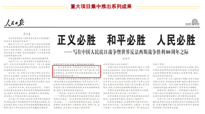On September 2nd, People's Daily Key Commentary Article titled "Justice Will Prevail, Peace Will Prevail, and the People Will Prevail - Written on the Occasion of the 80th Anniversary of the Victory of the Chinese People's War of Resistance against Japanese Aggression and the World Anti-Fascist War" was published. In the second part of the article, the achievements of our university's major project were cited, that according to Japanese historical materials, the Japanese invaders analyzed at that time that "the Communist Party is the main body leading China's ideological war", and "the Communist Party (Army) skillfully won the support of the masses and continuously carried out ideological disintegration work on the Japanese army. In the future, it will really be a matter of concern"...