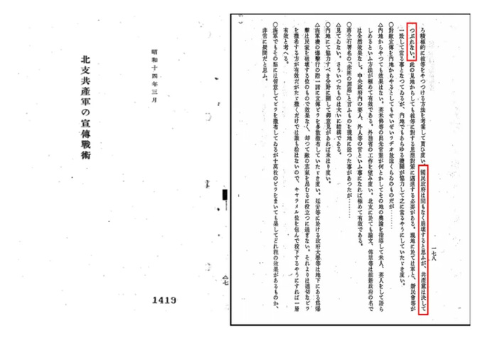 The Japanese side believed that the Communist Party of China was constantly achieving victory. In 1940, the archive "The Domestic Policy and Work Truth of the Communist Party of China" of the Intelligence Department of the Japanese Ministry of Foreign Affairs pointed out that "the cadres at all levels of the Communist Party of China have full sympathy for the 400 million working-class and peasant-class people in China", "the love of the Communist Party of China for the working-class and peasant-class can overcome everything", and "the Communist Party of China is constantly achieving victory."