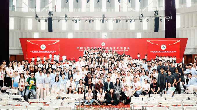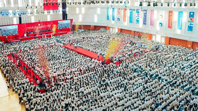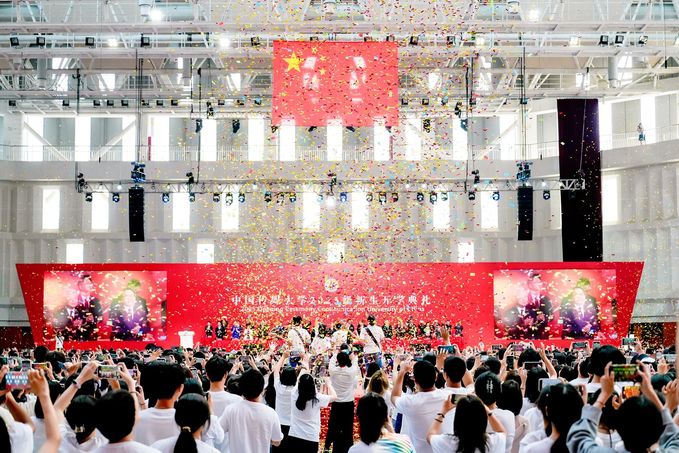 The opening ceremony had a main venue at the Beijing campus and a branch venue at the Hainan campus, enabling online interaction between the two campuses. The red stage in the freshmen's seating area at the main venue was shaped like an unfolded book page and also like a brand-new letter addressed to the future, blessing the students to embark on a new journey of exploration as "diligent learners".