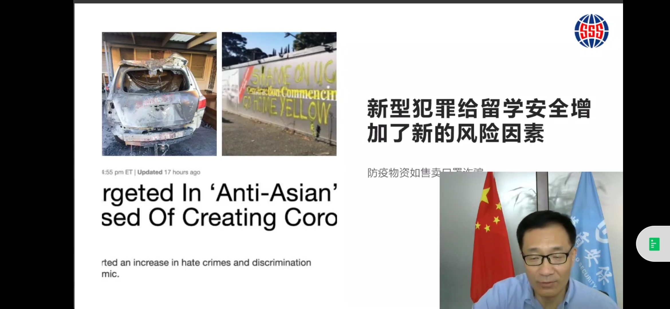 讲座伊始,赵志江老师分析了全球疫情新形势下留学安全的新特点,这些特点集中表现为:因戴口罩的文化差异和西方政客“甩锅”中国言论,致使中国学生在海外遭受不同程度的歧视,以及疫情下的新型犯罪已成为留学安全新的风险因素等。