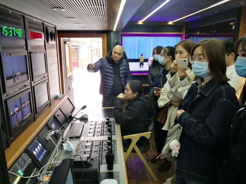 北京中数世纪传媒有限公司的副总经理、“像音像”工程负责人张哲老师首先带领同学们参观4K电视转播车,现场讲解录制的流程与细节:第一遍为演员们素颜录像,录制恰当节奏的演出全景。第二遍录制转向录音棚录音,确保声音的完美;第三遍录像,在舞台播放已有录音,演员们粉墨登场,正式演出,场下专家老师即时指导,确保每个细节到位。这就是“像音像”工程的名字来源。