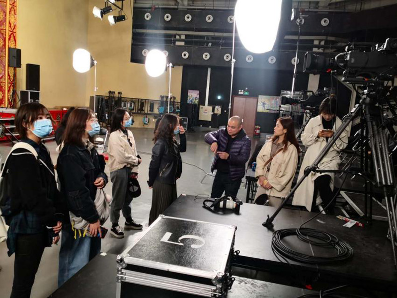 在休息的中场,现场人员向同学们演示了各个摄影机的不同功用及操作方法,同学们近距离地观摩和学习了专业录制设备的使用。