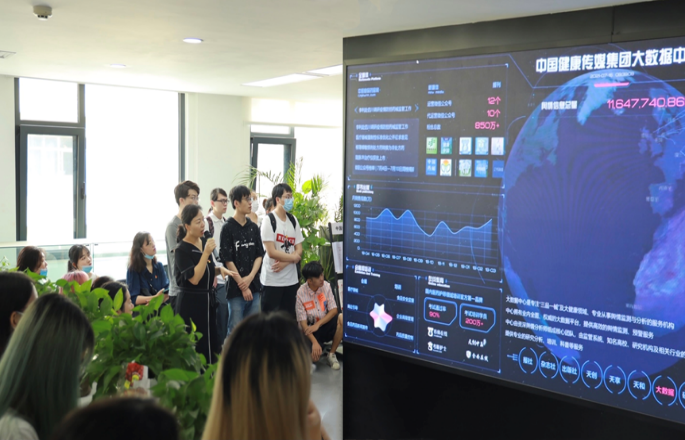 首先,师生来到位于中国健康传媒集团六层舆情中心的大屏幕前,详细了解集团的组织架构、主营业务、舆情分析系统及未来发展方向,深刻领略集团在新媒体融合与健康大数据开发领域的最新成果与应用。