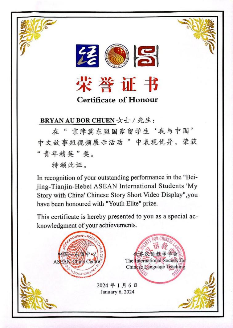 (通讯员尹梦)1月6日,首届京津冀东盟留学生“我与中国”中文故事短视频总展演活动在天津师范大学举办。该活动是在教育部中外语言交流合作中心、中国—东盟中心指导下,世界汉语教学学会、中国教育报刊社、中国教育国际交流协会支持下,由北京市教委、天津市教委、河北省教育厅联合主办,天津师范大学、北京外国语大学、河北师范大学共同承办的中文语言实践活动。我校2019级播音与主持艺术专业马来西亚籍学生区栢铨获得“青年精英”奖。并担任本次展演活动主持之一。