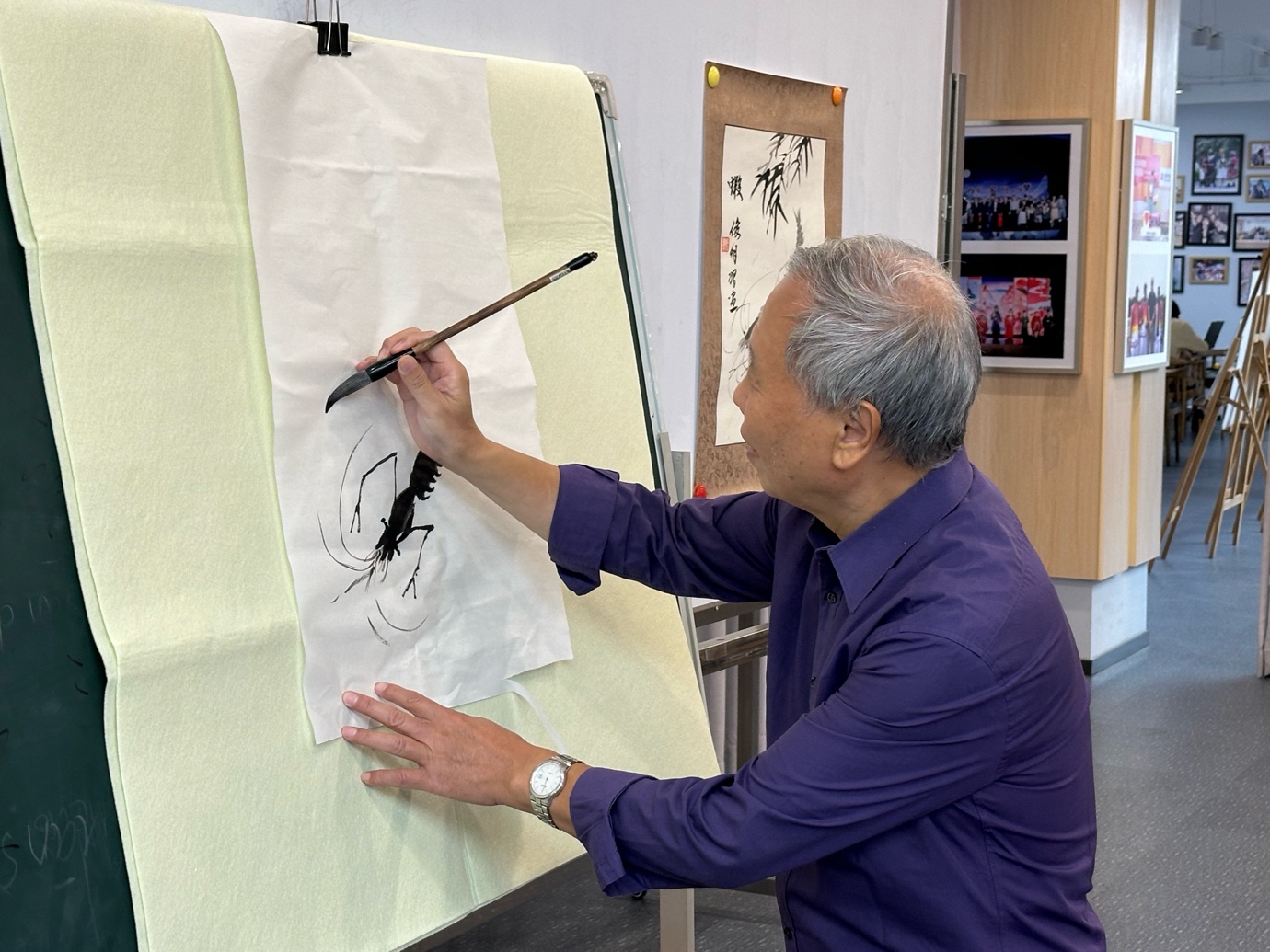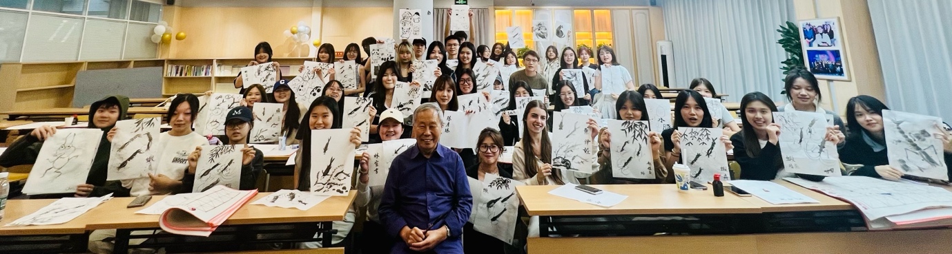 继书法讲座后,国际本科新生们又迎来了一场墨色之美的中国画韵讲座。以鱼和虾为主题,李俊明老师现场向学生们展示了中国画独特的技法与意境。