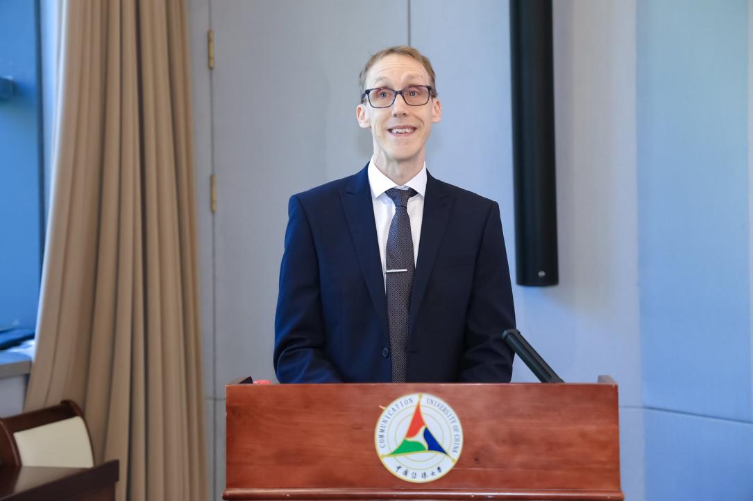 学位授予仪式后,Stuart Burch老师代表诺丁汉特伦特大学全体授课教师致辞。他表示,在两校合作的历史上,这是一个历史性时刻。首届广告专业毕业生作为“先锋者”具有特殊意义,他们永远是首批开拓者。他指出,项目提供的跨国教育经历赋予了各位同学看待世界的独特视角,世界迫切需要各位同学这样具有跨文化交流能力的专业人才。最后,他表示无论各位毕业生走向何方,这里永远是他们的“知识家园”,并祝愿他们未来好运,牢记人生唯一使命是“成为最出色的自己”。