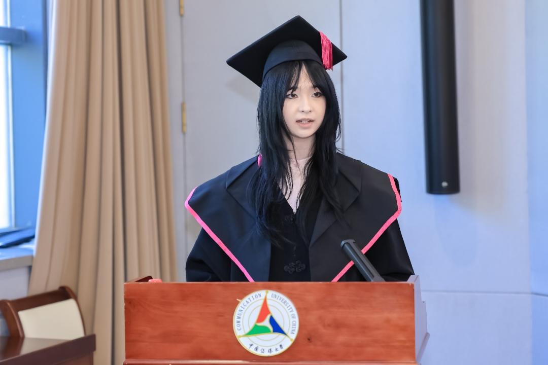毕业生代表董凝希在发言中回顾了中英两国校园的学习经历,她表示:“跨文化合作与海外交流培养了我们应对复杂挑战的能力,同学们在协作中建立的友谊与默契,将成为职业生涯中的宝贵财富。”她期待各位毕业生传承坚韧精神,在传媒领域践行责任与担当。