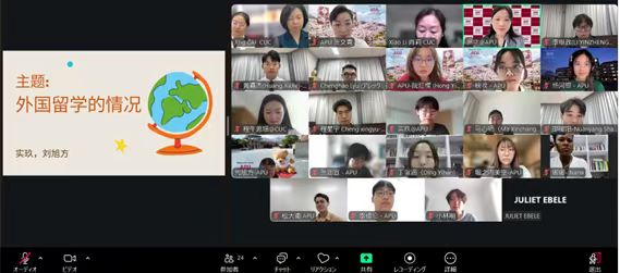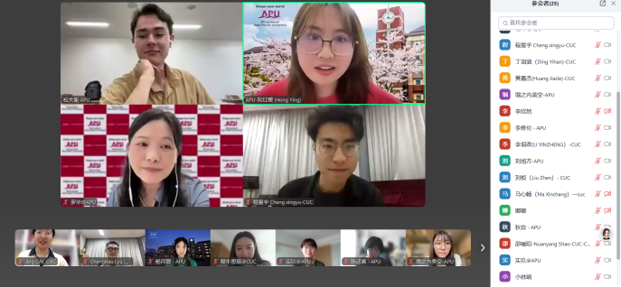 (通讯员 蔡静 丁诣涵 刘帧 摄影 蔡静 )6月26日,中国传媒大学国际传媒教育学院与日本立命馆亚洲太平洋大学(Ritsumeikan Asia Pacific University,简称APU)联合举办的线上跨文化交流课程(Global Learning)顺利举行。本次活动由日方课程教师罗华主持,以深化中日两校教育合作、拓展学生全球视野为宗旨,增进了青年间理解与友谊,为两校学子搭建了跨越国界的交流平台。