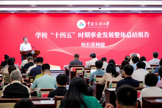 張樹庭校長は学校を代表して、「十四五」期間の事業発展に関する全体的な総括報告を行いました。報告によると、「十四五」期間は学校の発展史上、飛躍的な成長を遂げ、高品質な発展段階に入った画期的な5年間でした。この5年間、学校は第3回党大会で定められた目標と路線に沿って、絶えず「奮闘の筆」で「得意の作品」を描き、「中国特色の世界一流の伝媒大学」という奮闘目標が深く人心に根付き、「三つの飛躍」という戦略的な任務が着実に推進されました。
