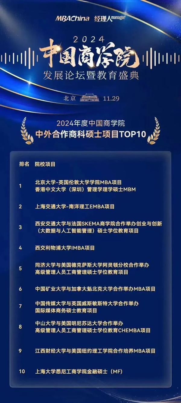 2024年11月29日,“2024年度中国商学院发展论坛暨教育盛典”在京举行。该论坛由《经理人》杂志和MBAChina联合主办,活动现场发布了“2024年度中国商学院中外合作商科硕士项目TOP10”榜单。