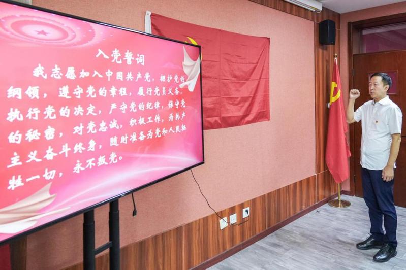 李众副书记带领全体同志面对鲜红党旗,重温入党誓词:“我志愿加入中国共产党,拥护党的纲领,遵守党的章程,履行党员义务,执行党的决定,严守党的纪律……”全体党员紧握右拳,神情肃穆,精神饱满,声音铿锵,字字扣心,彰显出每一位党员对铭记光辉历史的恒心、对初心使命坚守的信心以及坚定跟随党的步伐的决心。