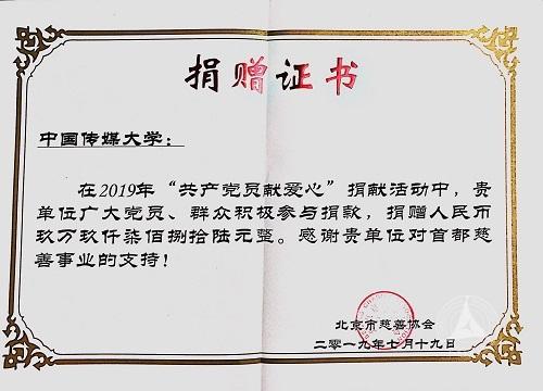在纪念中国共产党建党98周年之际,根据北京市委有关要求,学校组织开展了2019年 “共产党员献爱心”捐献活动。全校共有1236名共产党员、57名入党积极分子和22名群众参与了此次活动,筹集善款99786元,捐款数额达历年最高。7月19日,党委组织部将善款捐献给北京市慈善协会,协会工作人员向我校师生表示了衷心感谢。